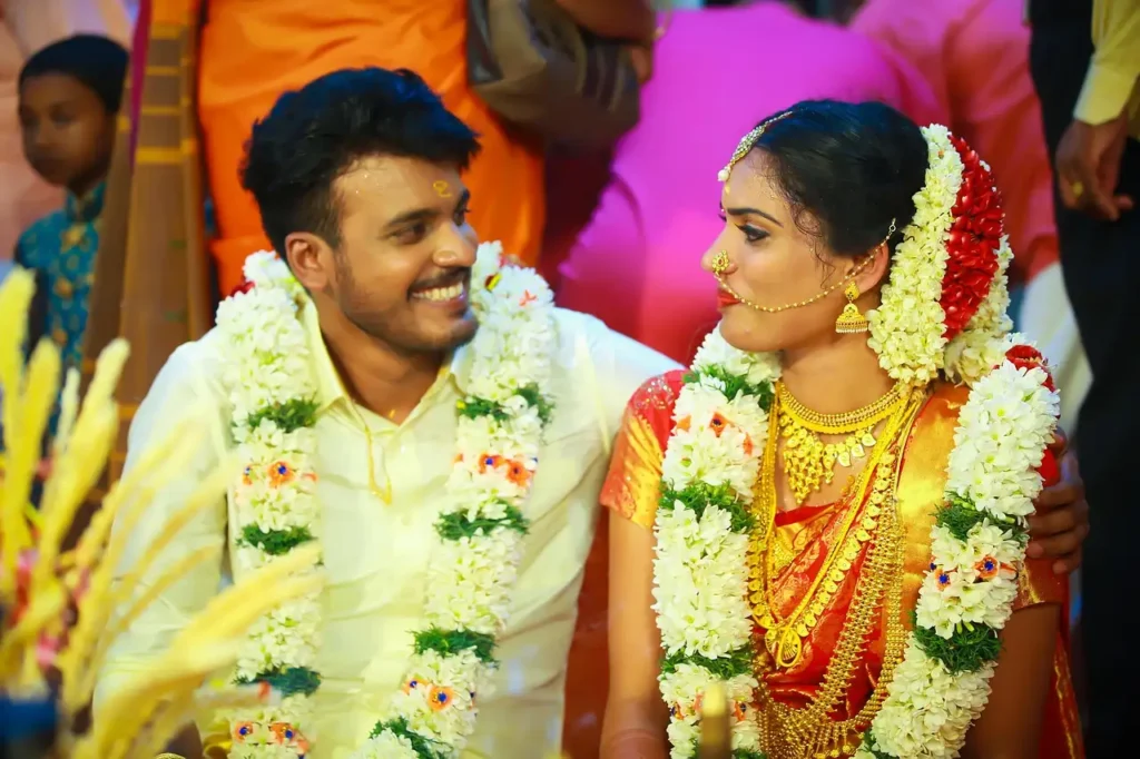 A timeless celebration of love and tradition, Sreeraj and Sreethu’s wedding was a graceful blend of Kerala heritage and royal elegance. Hosted in a grand indoor venue adorned with golden mandap panels and vibrant floral arrangements, the atmosphere exuded warmth and sophistication
